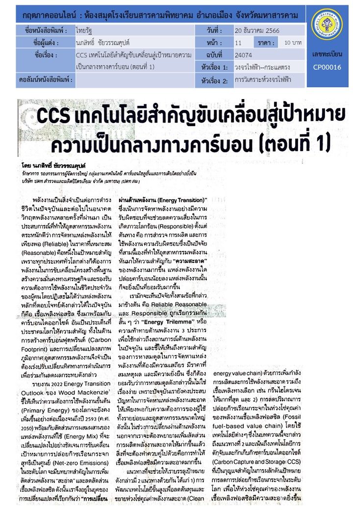 CCS เทคโนโลยีสำคัญขับเคลื่อนสู่เป้าหมายความเป็นกลางทางคาร์บอน (ตอนที่ 1)
