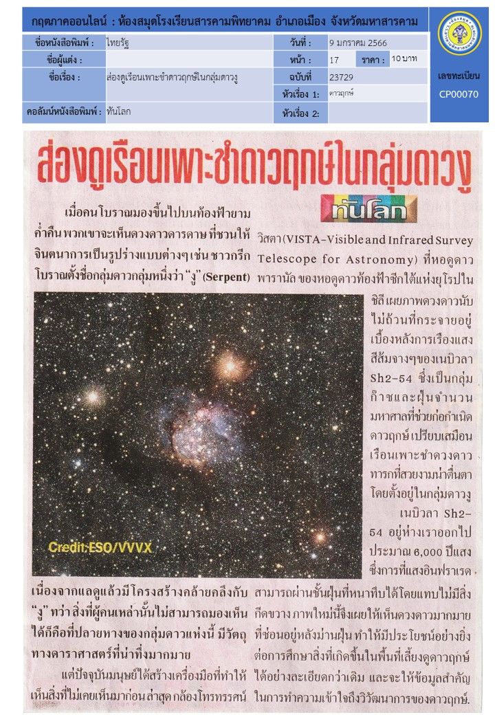 เนื้อหาย่อ : กฤตภาคออนไลน์ : ห้องสมุดโรงเรียนสารคามพิทยาคม อำเภอเมือง จังหวัดมหาสารคาม
