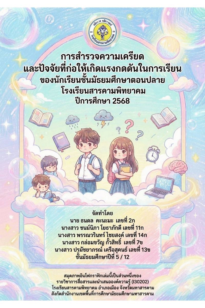 เนื้อหาย่อ : การสำรวจความเครียด และปัจจัยที่ก่อให้เกิดแรงกดดันในการเรียน ของนักเรียนชั้นมัธยมศึกษาตอนปลาย โรงเรียนสารคามพิทยาคม ปีการศึกษา 2568